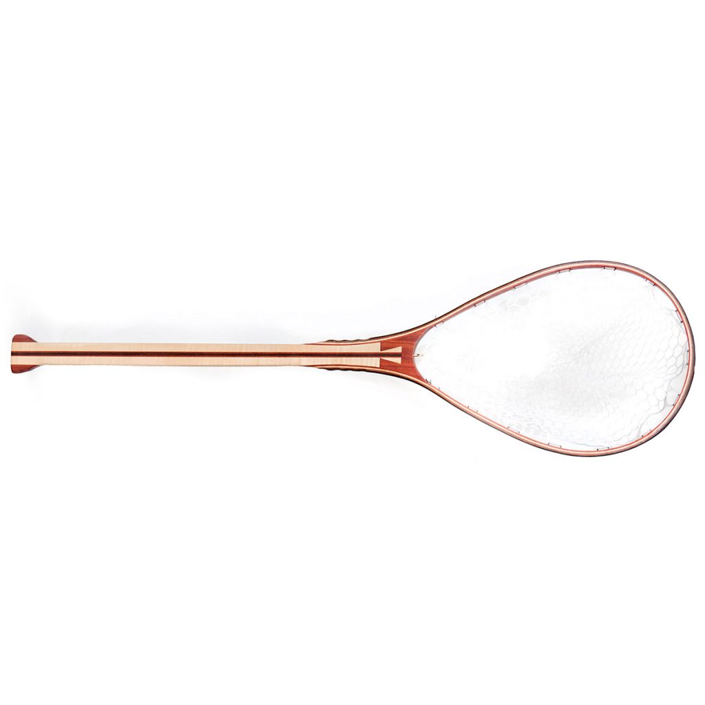 Handcrafted 48 inch landing net created from wenge, paduk, curly maple, and lacewood.